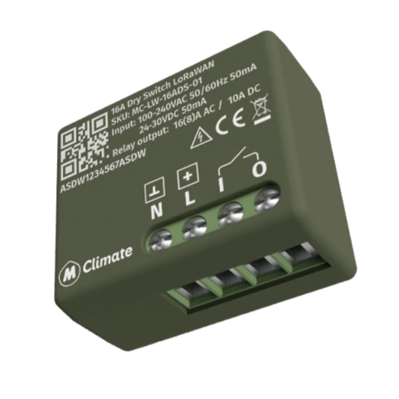 The МClimate 16А Dry Switch LoRaWAN® is a miniature device that features a dry 16A relay. The device is small enough to fit behind most wall switches and power equipment, enabling you to automate, track, and control your electrical appliances. The device has 4 terminals L, N, I, O, connecting and disconnecting I from O. The 16А Dry Switch features an overheating protection mechanism, operates in LoRaWAN Class C, and as all other MClimate devices supports FUOTA (Firmware Upgrades Over The Air).
